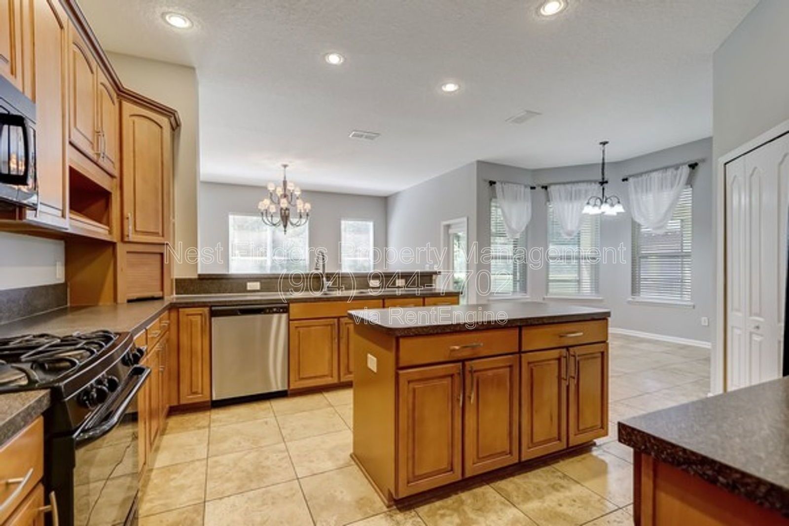 The large kitchen is a chef's dream, featuring a breakfast nook and a convenient food prep island. With ample counter space and modern appliances, this kitchen is as practical as it is beautiful. The tile and laminate flooring throughout the downstairs area offer durability and easy maintenance.