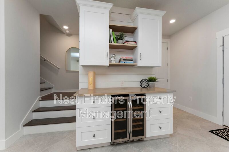 The first level welcomes you with a versatile guest suite complete with a full bath and a private patio, providing an ideal retreat for guests. On the second level, you'll be greeted by an expansive open concept layout. The heart of the home is a stunning oversized gourmet kitchen featuring quartz countertops, stainless steel appliances, and a separate coffee bar with a wine fridge. Beautiful tile flooring flows seamlessly throughout this level. The spacious living room boasts a beautiful accent wall. There is also a half bathroom, which adds convenience for guests.