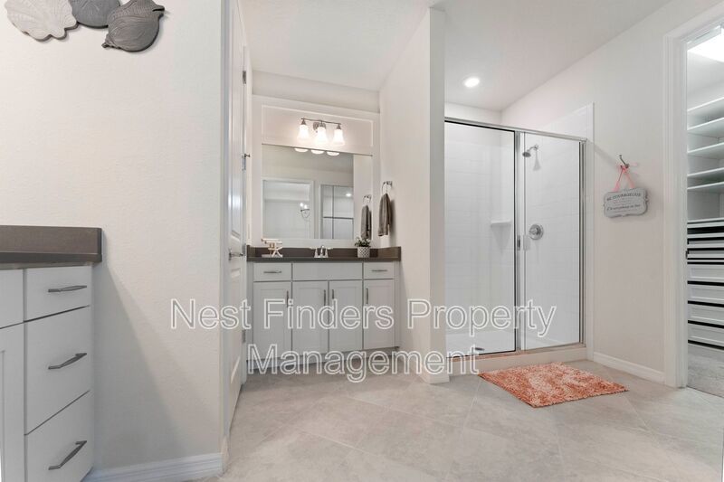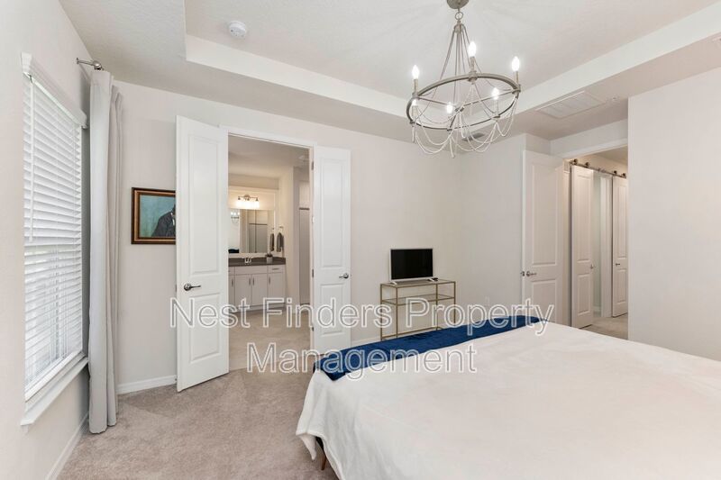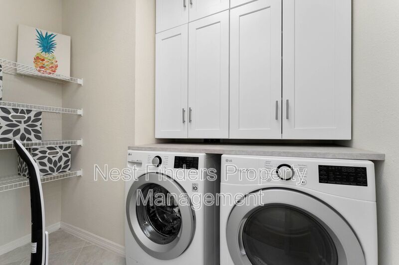 Venture upstairs to discover the luxurious primary bedroom retreat, complete with custom closets, a walk-in shower, and dual vanities. There is a second guest bedroom with an ensuite bath and a huge closet, providing ample space and privacy. A spacious laundry room with full size washer/dryer included.