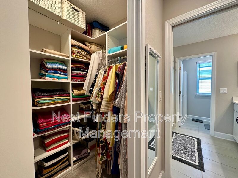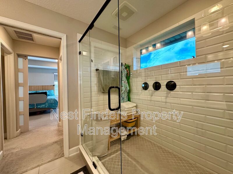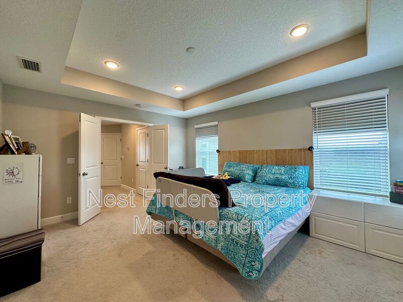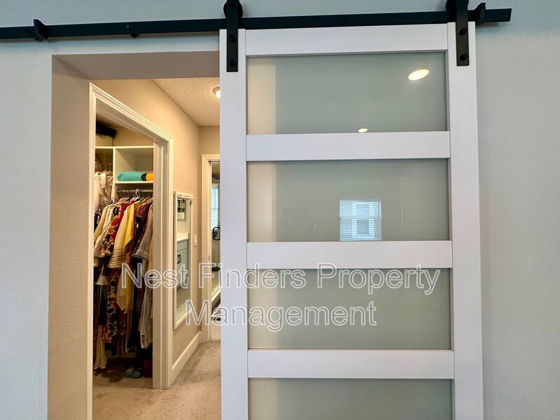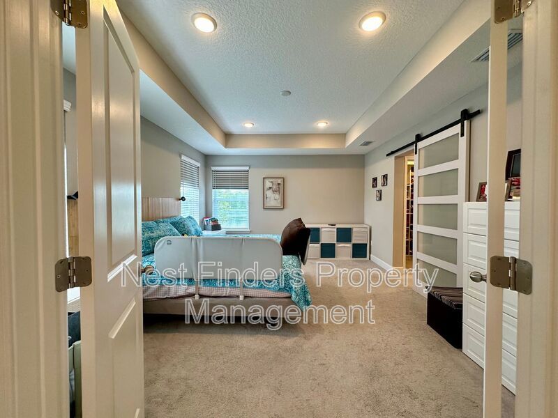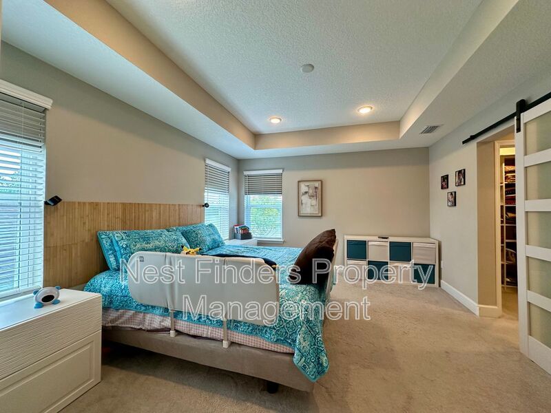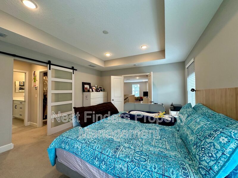 The expansive primary suite, accessed through elegant double doors, features tray ceilings and serene lake views. Enjoy the luxury of His and Her custom closets behind an upgraded barn door, and unwind in the primary bath with its oversized walk-in shower, rain head, dual sinks, and a private water closet. Two additional bedrooms upstairs share a full bathroom with dual vanities, and all bedrooms are equipped with blackout shades for added comfort.