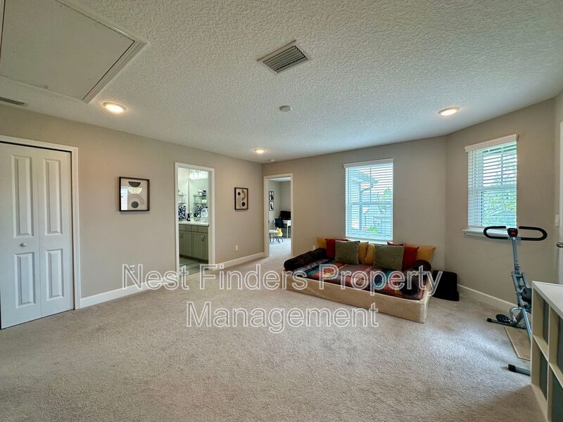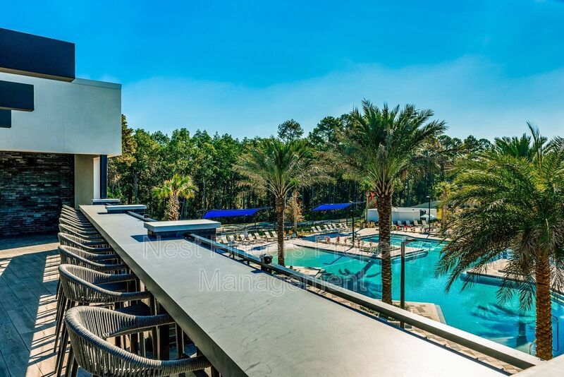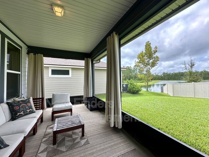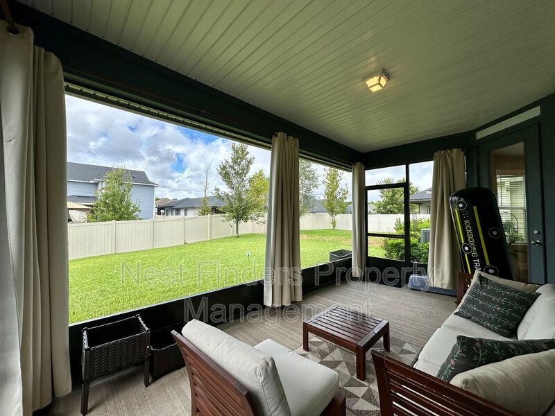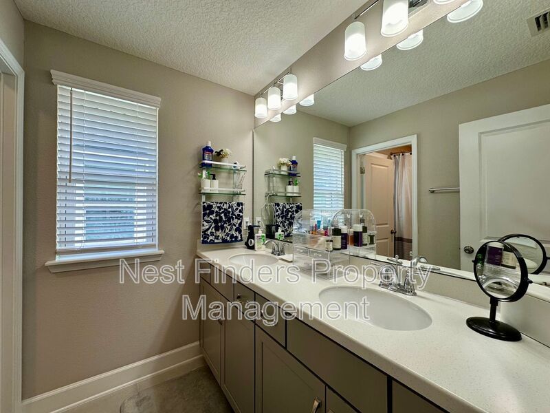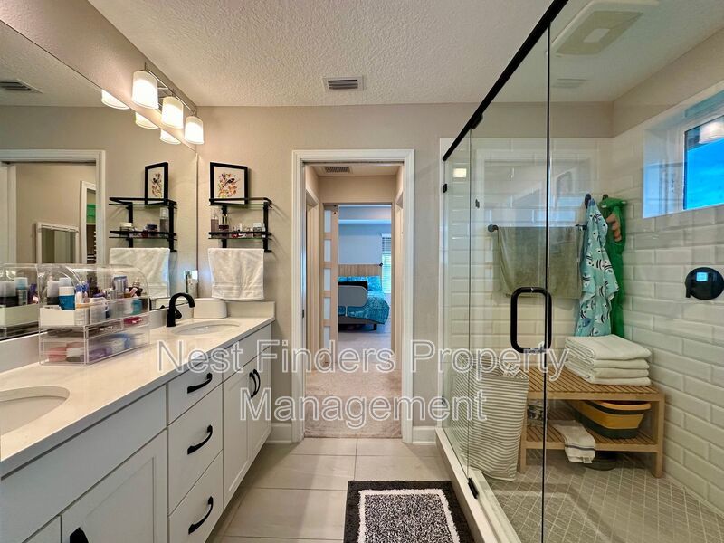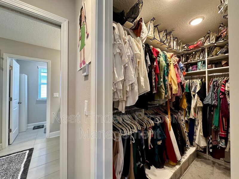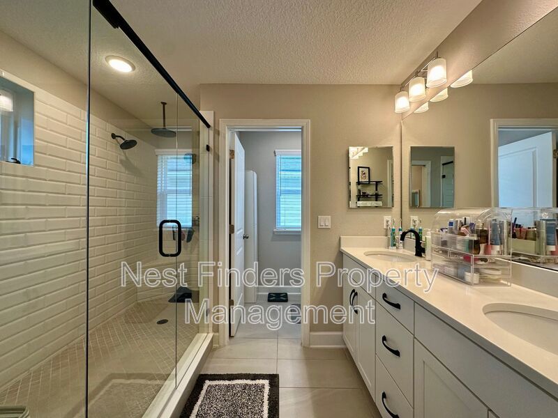 The expansive primary suite, accessed through elegant double doors, features tray ceilings and serene lake views. Enjoy the luxury of His and Her custom closets behind an upgraded barn door, and unwind in the primary bath with its oversized walk-in shower, rain head, dual sinks, and a private water closet. Two additional bedrooms upstairs share a full bathroom with dual vanities, and all bedrooms are equipped with blackout shades for added comfort.