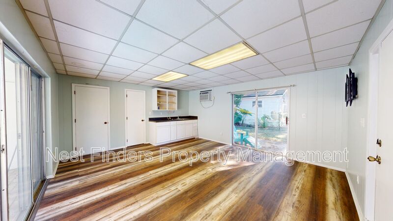 The main residence features two generously sized bedrooms and two full bathrooms. As you step inside, you’re welcomed by warm wood flooring that leads to an inviting open living area and a separate dining space. The kitchen is a standout, showcasing stunning granite countertops, sleek white cabinetry, and modern stainless steel appliances. Thoughtful custom shelving and fixtures add a charming touch. The indoor laundry room comes equipped with a washer and dryer for your convenience.